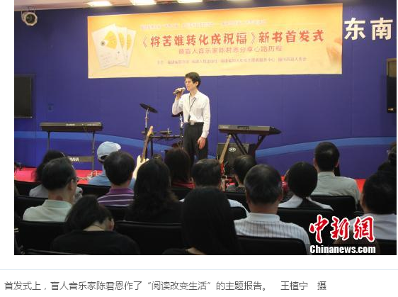 中新网福州10月11日电 (记者 刘可耕)第32届国际盲人节即将到来之际,由福州盲人音乐家陈君恩耗时八年写成的《将苦难转化成祝福》新书首发式11日在福建省图书馆举行。