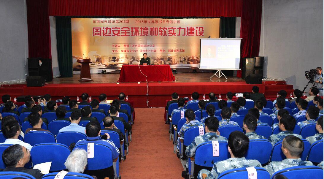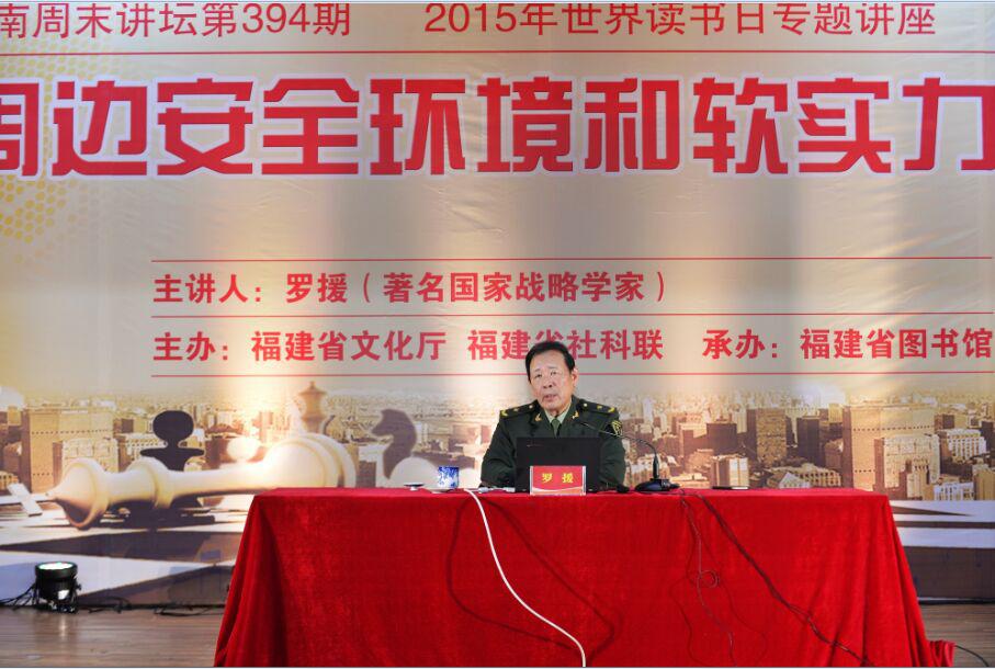 作为2015年世界读书日活动的重头戏,4月25日福建省图书馆“东南周末讲坛”特邀中国军事科学院世界军事研究部原副部长、研究员、博士生导师,著名国际战略学家罗援少将,主讲《周边安全环境和软实力建设》。这场面向大众的讲座,同时省文化厅也作为国防教育和中心组的学习内容,讲座由省文化厅党组成员、驻厅纪检组长张佩煌主持,省社科联党组书记、副主席冯潮华致辞,海军福建基地、中国人民解放军61716部队等多位军地领导参加了讲座。