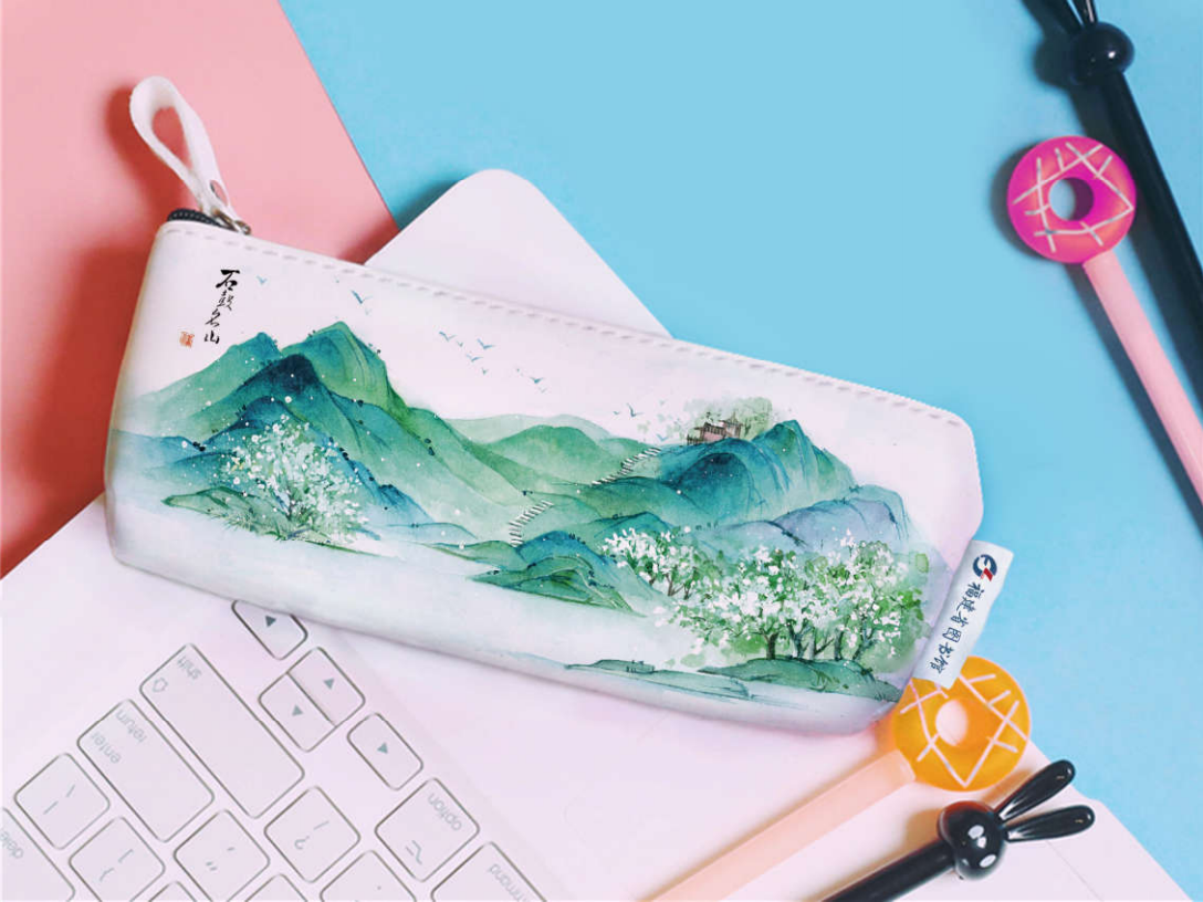 鼓山地处福州东郊,早在一千多年前就已闻名遐迩。元代帖木儿曾在《游鼓山大顶峰》诗中写道“肩舆直上白云梯,古刹林深路欲迷“, 表达了登高路险的揽胜历程,抒发立足绝顶的旷世情怀。这款笔袋以水彩作画,描绘出登顶鼓山俯瞰群山环抱的博大苍茫之景,为学习生活增添一份诗意。