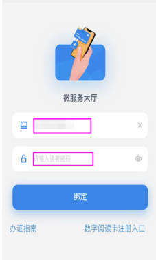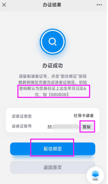 进入“福建省图书馆”微信公众号,点击菜单栏“微服务大厅”——“办证服务”——“社保卡办证”。按提示完成办证后可复制读者证号进行微信端绑定。