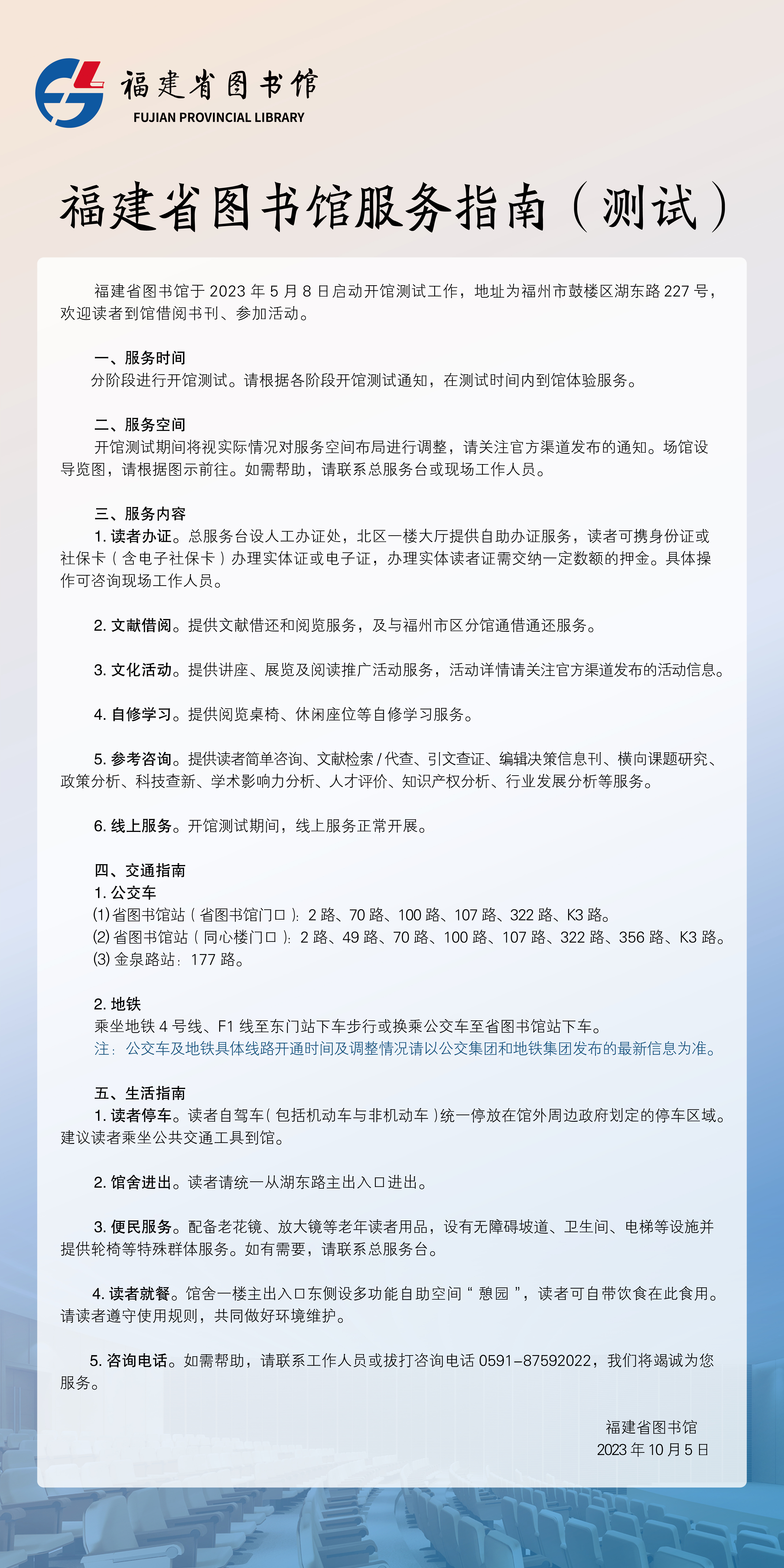 | 5 | 福州金鸡山公园分馆 | 福州金鸡山公园茉莉花厅 | 夏:周二-周四 8:00-11:00 17:30-20:30 周五-周日 8:00-11:00 17:30-21:00 冬:周二-周四8:30-12:00 14:30-18:00 周五-周日8:30-12:00 14:30-19:30 (周一闭馆) |