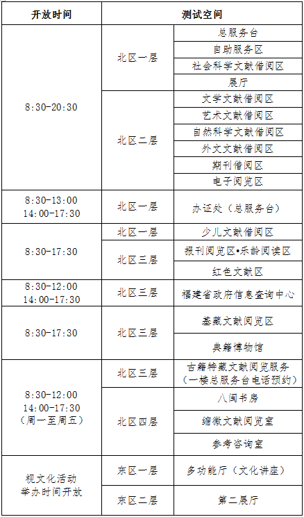 福建省图书馆开馆测试期间各服务空间开放时间安排