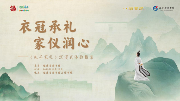 为全面贯彻落实党的二十届三中全会精神,深入学习贯彻习近平文化思想及习近平总书记在福建考察时的重要讲话精神,着眼提升文旅公共服务效能,紧紧围绕“在提升文化影响力、展示福建新形象上久久为功”的重要要求,福建省图书馆将于2025年10月26日在福建省图书馆正谊书院举办衣冠承礼·家仪润心——《朱子家礼》沉浸式体验雅集,通过可感、可触、可行的沉浸式体验,激活古典智慧的生命力,让您在与古为邻的温情与敬意中,筑牢对中华优秀传统文化的认同与自信,共同传承中华优秀传统文脉薪火。我们将共同——