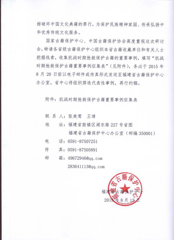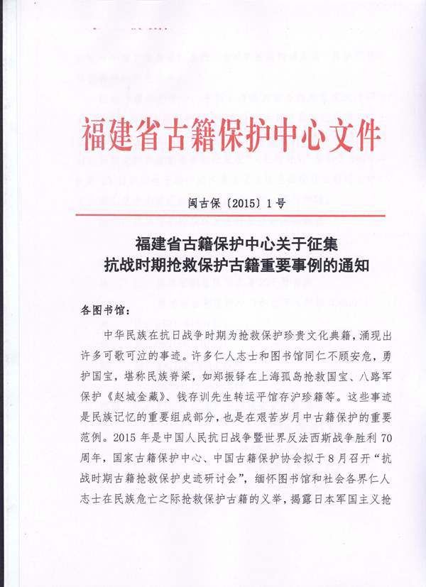 福建省古籍保护中心关于征集抗战时期抢救保护古籍重要事例的通知