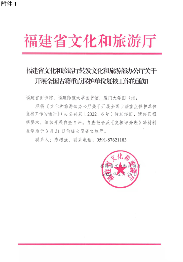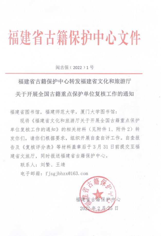福建省古籍保护中心转发福建省文化和旅游厅关于开展全国古籍重点保护单位复核工作的通知