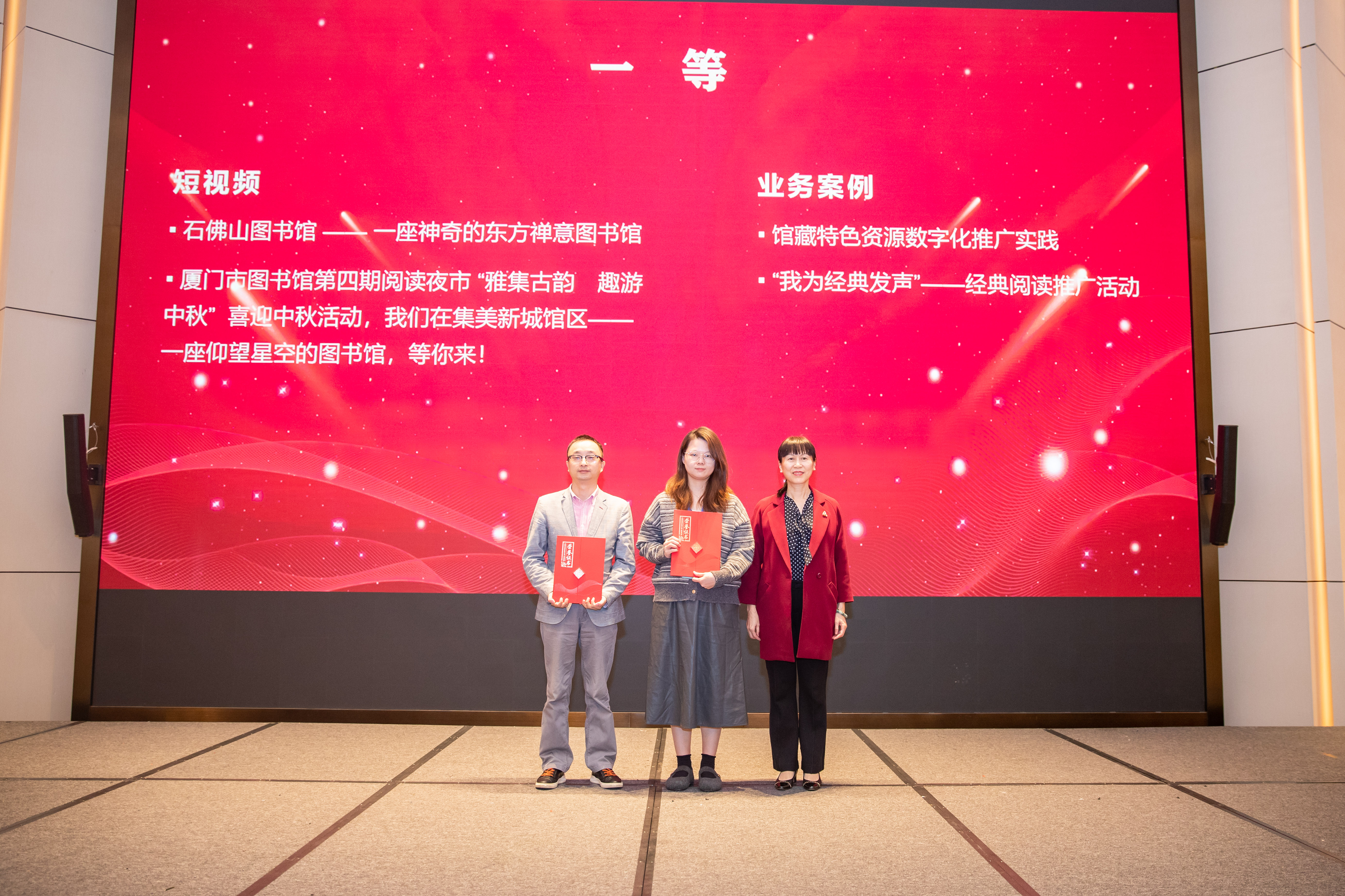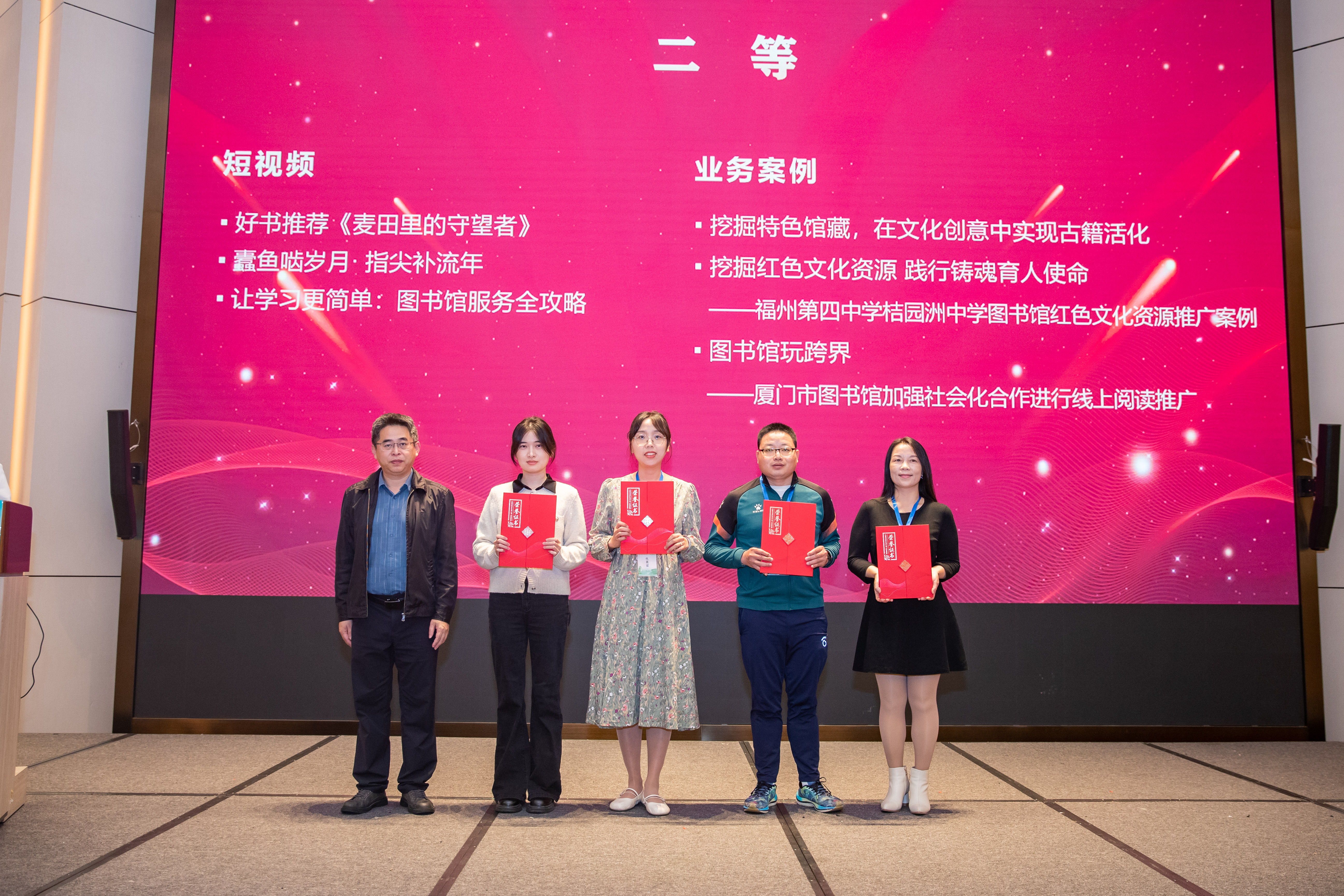 随后,会议进行阅读推广短视频与业务案例颁奖仪式。从前期征集到的84个短视频和业务案例中,分别评选出短视频与业务案例一等2个、二等3个、三等4个、优秀11个。林林馆长、傅文奇教授、曾兴德副馆长分别为等级荣誉获得代表颁发荣誉证书。