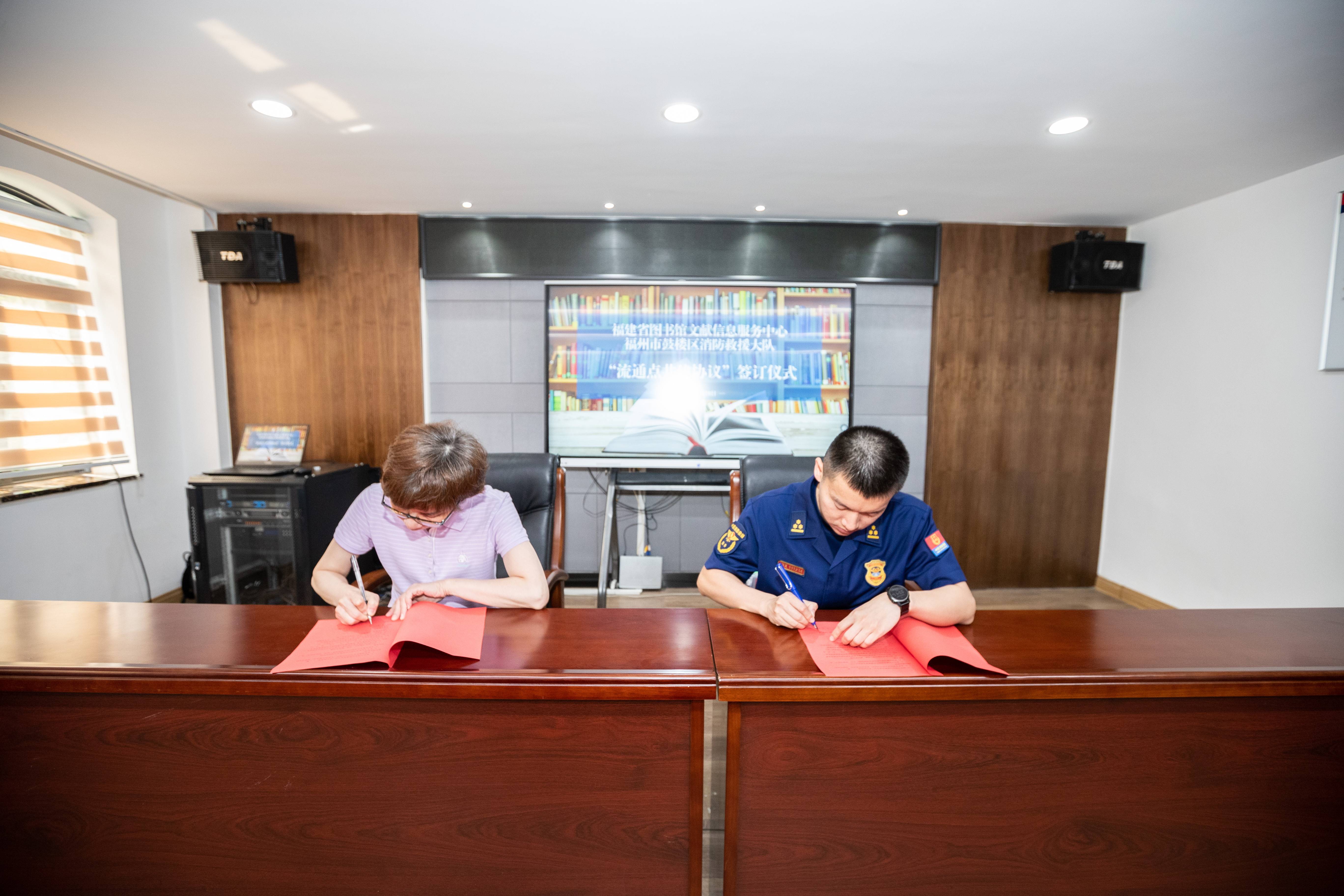 活动现场,双方进行共建协议签订仪式,由福建省图书馆第二党支部与福州市鼓楼区三坊七巷救援站党支部签订党建共建协议,由福建省图书馆文献信息服务中心与福州市鼓楼区消防救援大队签订《共建图书馆服务流通点协议书》。