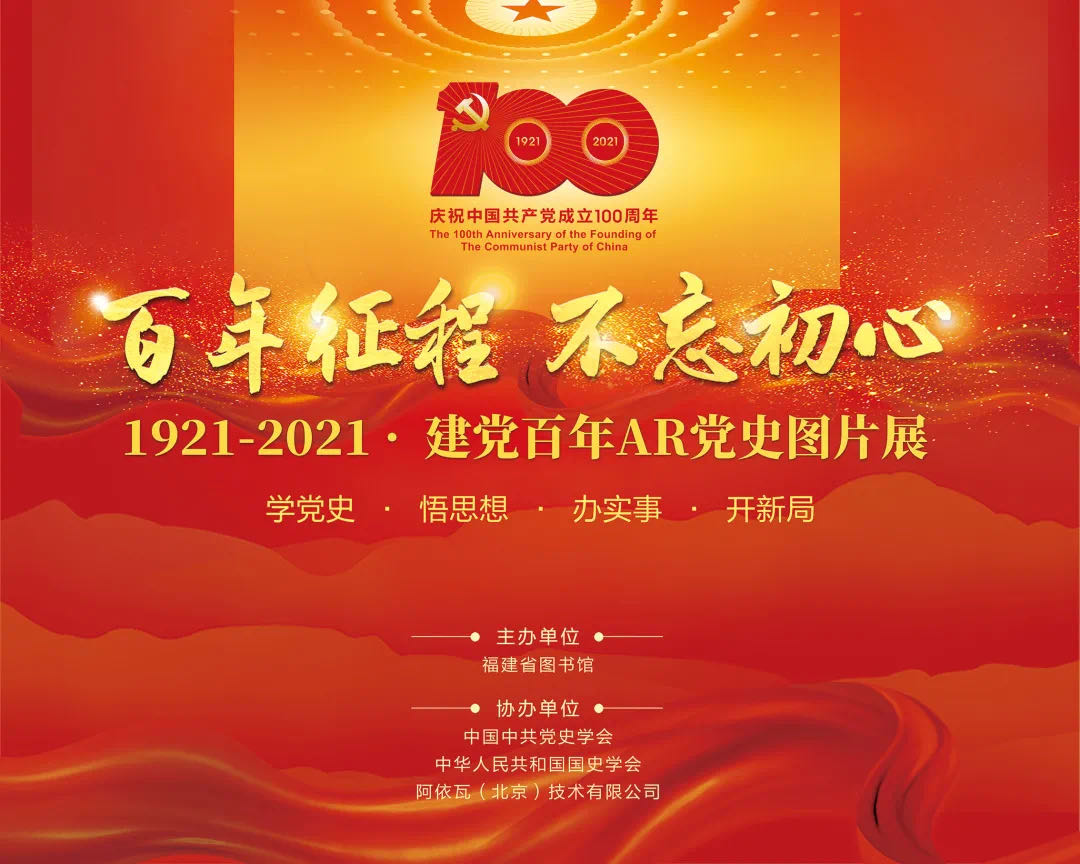 为庆祝中国共产党成立100周年,聚焦党的百年历程,展现党的辉煌成就,向党的百年华诞献礼,福建省图书馆于2021年6月19日至7月9日举办“百年征程 不忘初心”建党百年AR党史图片展。展览以中国共产党“开天辟地”“改天换地”“翻天覆地”“奋进新时代”四个篇章为主题,展出120多幅图片,用图文并茂的形式讲述了中国共产党百年来走过的光辉历程。展览由建党百年党史图片展及党建智屏沉浸式互动体验展区两个部分组成。