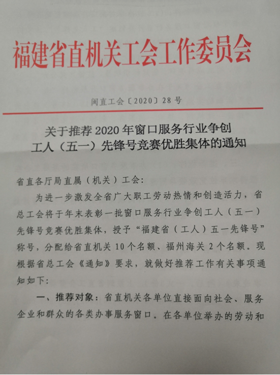 现将福建省直机关工会工作委员会《关于推荐2020年窗口服务行业争创工人(五一)先锋号竞赛优胜集体的通知》(闽直工会〔2020〕28号)转发给你们。请各工会小组做好通知工作,组织符合申报条件的服务窗口部门积极申报,并于11月20日(本周四)下午下班前,将申报表纸质版(盖章,一式3份)报送至馆工会。