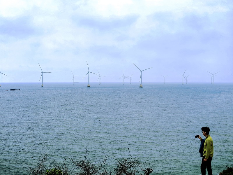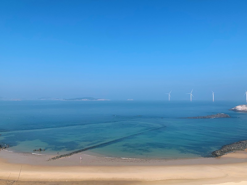 作品简介:这张图片展示的是平潭的海滩。天气晴朗的时候,海天一色。海面上的风力发电机排成一字,它们的设计类似于传统的风车,但现代化的结构使得它们能够高效地利用风能发电,展现出自然与科技的和谐共存之美。白色的沙滩平整无痕,整个画面给人一种恬静平和之感。