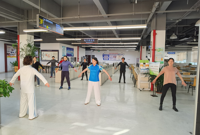 此次健身培训实践活动分为成立健身兴趣小组和健身培训两个阶段。第一个阶段,2021年10月底至12月初,通过工会小组进行摸底,分别成立了针对中年馆员的太极拳、八段锦组和针对青年馆员的健身操组2个健身兴趣小组;第二个阶段,2021年12月中旬日至2022年3月底,针对不同健身兴趣小组分别聘请不同的专业健身教练,组织开展共计6期的针对性健身培训,进而引导广大干部职工科学健身,以更加健康的体魄更好地为图书馆事业再做贡献。12月16日,第一期健身培训开班,两个健身兴趣小组共有50多人参加。