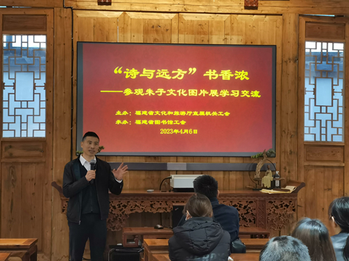 由省文化和旅游厅直属机关工会主办、省图书馆工会承办的“诗与远方”书香浓——参观朱子文化图片展学习交流活动于2023年4月6日在福建省图书馆正谊书院举行。活动主要包括参观“朱子印迹 闽都遗珍一-福州朱子文化遗存遗迹图片展系”和学习交流等两个环节的内容。此次活动旨在“五一”国际劳动节和“4.23世界读书日”来临之际,聚焦省委“三争”行动部署,深入挖掘朱子文化的当代价值,全面提振干部职工精气神,助力文旅融合发展。
