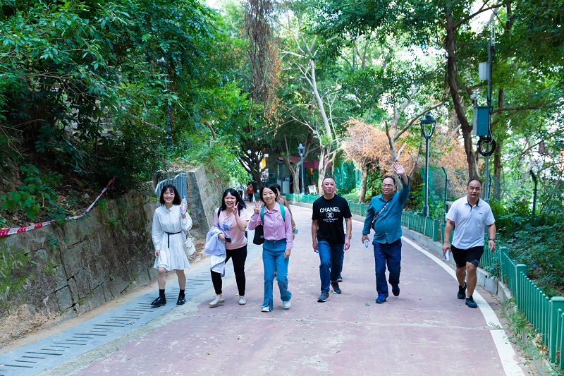 金鸡山公园位于福州晋安区金鸡山麓,像一颗硕大无比的碧绿翡翠,纵卧在晋安河东岸。金鸡山是福州市唯一由环城山脉嵌入市区的山,如今依然保留着大自然山林的原始风貌,是福州城区少有的山野情趣浓郁的景区,负氧离子浓度高,空气清新。宛如彩虹般横跨金鸡山山脊的空中廊道,红色的飞虹桥大气壮观,连接着魏杰故居与观晋台所在的两个山头,联通了环山栈道和览城栈道。飞虹桥绝佳的地理位置,让往来匆匆的游客,既能享受“森”呼吸,又能饱览繁“城”景。漫步生态廊道,停下脚步,与原始的山林打个招呼,看鸡矢藤、红叶石楠、牵牛花等花草竞相绽放。大家成群结队拾级而上,体验着汗水带来的欢乐,展现闽图人乐观向上的精神风貌。